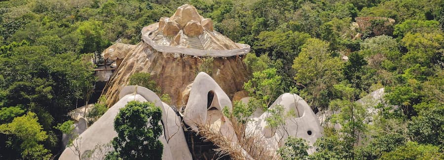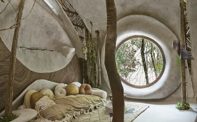 La arquitectura integra formas orgánicas, detalles artesanales y materiales que evocan piedras esculpidas, evitando líneas rectas para transmitir fluidez. Cada residencia ofrece vistas únicas a la selva y se adapta libremente a distintas necesidades, formando parte de un plan maestro circular e interconectado.